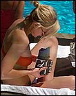Christina Aguilera doing a photoshoot wearing a lacey semi see-through black outfit and then posing topless and in jeans with little blur marks covering her nipples which occasionally fail to cover them revealing her nipples and nipple rings from MTV Diary.